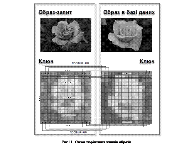 При пошуку зображень за індексами кластерів, на етапі індексації отримані співвідношення фрагментів та кластерів формують ключі образів. До ключа образу, таким чином, входить позиція фрагмента та його відношення до певного кластера (індекс кластера). На етапі пошуку отриманий таким же чином ключ образу-запиту використовується як еталон для пошуку. Схема порівняння ключів включає в себе порівняння індексів кластерів відповідних фрагментів (рис.11).