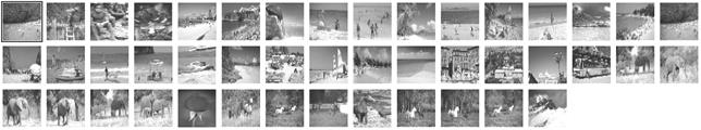 Для ілюстрації результатів виконання пошуку з різними параметрами використано три тестові зображення із різних категорій (пляжі – відсутність чітких об’єктів на зображенні, динозаври – чіткий об’єкт на однорідному фоні, коні – чіткий об’єкт на неоднорідному фоні). Для порівняння проводилося із середньоквадратичною похибкою різниці індексів 0, 47. На рис.12-14 подано результати виконання пошуку при фрагментації зображень 15x15 фрагментів із кількістю кластерів 6.