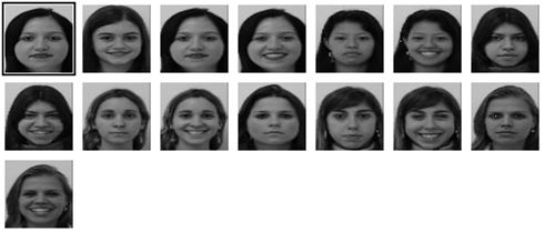 Пошук зображень за розподіленими ознаками. Для тестування прийнято у базу з 200 знімків з пар облич з різними виразами [14]. та базу Ванга з 1000 зображень, розбитих на 10 категорій. Розмірність кривих становить 50 сегментів. Критерієм пошуку використано середньоквадратичне відхилення шуканого зразка від наявних в базі даних екземплярів. Для кривих різних характеристик вирази для похибки тотожні. Використано алгоритм пошуку, представлений в роботі [16]. На рис. 4 наведені приклади результати пошуку жіночого обличчя за ознакою середньоквадратичного відхилення координат пік селів у сегменті. Рис 4а представляє знімки 20 жінок, тобто усіх наявних в базі даних. Зменшення похибки пошуку звужує ряди знайдених знімків до двох присутніх (рис.4б, в).