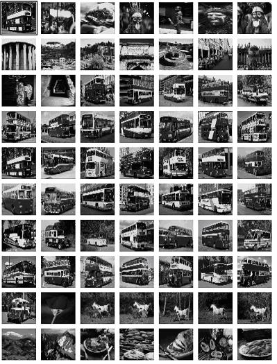 б Рис. 5. Приклади пошуку образів за розподіленими ознаками Для зображень з значним перемішуванням інтенсивностей у площині (прикладами можна вважати африканські краєвиди, харчі, міські пейзажі тощо) точність пошуку коливалась в межах 10 - 30 відсотків. Результати пошуку залежать від виду зображення: для виразного поділу інтенсивностей, характерного для групи образів, ця група формується алгоритмом як відповідь; якщо зображення не має виразних регіонів, відповідь містить образи різних категорій. У цих випадках однієї статистичної ознаки замало і пошук необхідно здійснювати за двома і більше ознаками. Зменшення похибки приводить до знаходження запиту.