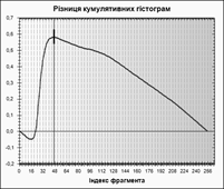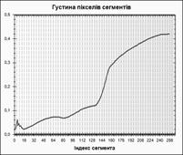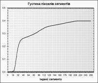 Для цього розділяємо інтенсивність вхідного зображення на 4 частини лощинами з кроком 60 (рис. 4): 0-60, 60-120, 100-180, 180-255. Для кожного фрагмента застосуємо алгоритм сегментування за кумулятивною гістограмою. Є дві методики з однаковими результатами, але що відрізняються трудоємністю. Перший – це застосування до повного зображення багатофрагментногї моделі кумулятивної гістограми гіпотетичного зображення [ ] або застосування до кожного з фрагментів з рис. Однофрагментної моделі гіпнотичного зображення. Максимуми функцій В останньому фрагменті порогом приймається координата єдиного мінімуму, що розділяє різні швидкості наростання чорного і сірого кольорів.