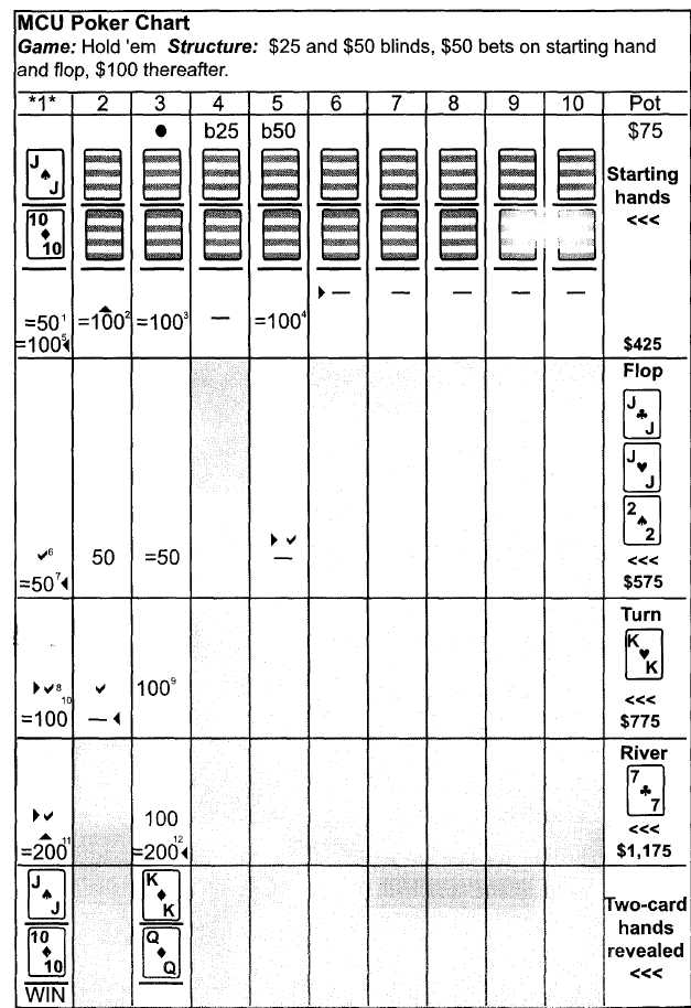 MCU Poker Charts был разработан мной из-за потребности в едином способе представления «рук» в печатной и электронной форме. Схемы читаются слева на право и сверху вниз, как обычные книги. Действия происходят последовательно. Таким образом, вы видите «колл», «фолд», или появление карт на столе, именно в той последовательности, в которой это происходило. Действия, записанные в таблице первыми – читая слева направо, сверху вниз – происходили в первую очередь. Всё, что появляется в чате позднее - читая слева направо, сверху вниз – случилось позже. Для вашего удобства, каждый MCU Poker Chart снизу имеет «легенду», вкратце поясняющую, как трактовать схему, на случай, если вы забыли. В этой книге мы будем использовать три разновидности MCU Poker Charts – каждую для отдельного вида покера: холдем, семикарточный стад, дро-покер. Далее приведены примеры каждой из этих трёх схем, начиная с холдема.