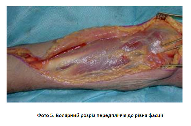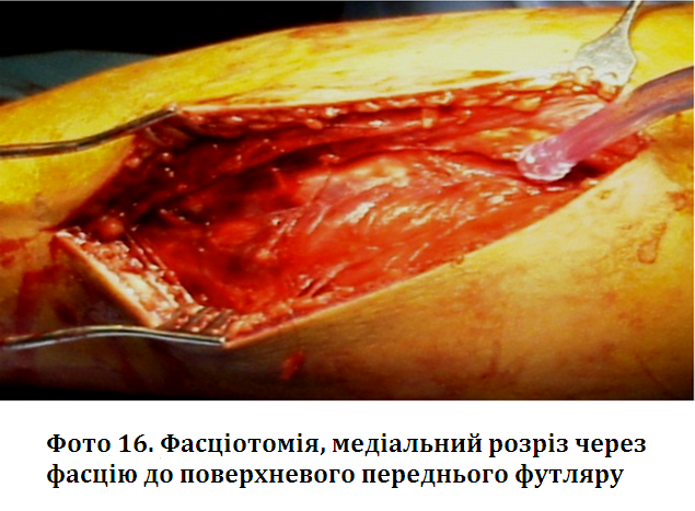 в. біля ліктя, радіально до медіального епікондиліту, розріз вигнуто через ліктьовий згин та відкриває глибоку фасцію; г. в ліктьовій ямці відкривається фіброзна зв’язка фасції, з'єднаної з м’язом, що розташована над плечовою артерією та медіальним нервом; д. цей розріз дає можливість захистити нейроваскулярні структури мяких тканин в зап’ясній та ліктьовій ділянках і запобігає контрактурі м’яких тканин на згинових складках; е. можна зробити другий прямий дорсальний розріз для вивільнення дорсального футляру, за потреби вивільняючи і латеральний футляр. 3. Ускладнення: а. при пізній діагностиці синдрому тривалого стиснення передпліччя може розвинутись ішемічна контрактура Фолькмана; б. може розвинутись ішемічна контрактура з сильним фіброзом м’язів, нейропатія та нефункціональність кінцівки з обмеженими варіантами лікування.