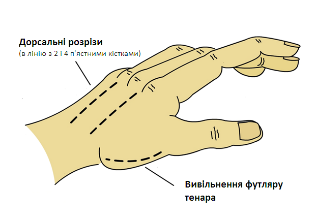 а. Пальмарний розріз зроблено між м’язами підвищення великого пальця та підвищення мізинця, відкриваючи зап’ястний канал наскільки це потрібно. б. Розріз проведено поперечно по складці згину кисті до ліктьової частини, далі лінію вигнуто по волярній зоні назад до ліктьової частини біля ліктя.
