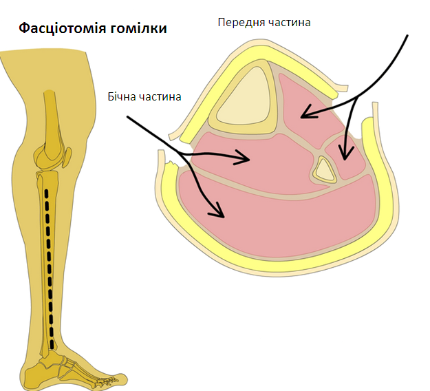 б. дорсальний розріз над п’ястною кісткою вказівного пальця вивільняє 1 і 2 дорсальні міжкісткові футляри та надає доступ до п'ястної кістки від середнього до вказівного пальця та для вивільнення волярного міжкісткового футляру та відвідного м’яза великого пальця; в. дорсальний розріз над п’ястною кісткою безіменного пальця вивільняє 3 і 4 дорсальні міжкісткові футляри та надає доступ вниз уздовж радіальної частини безіменного пальця та метатарсалії мізинця для вивільнення волярного міжкісткового футляру. г. розріз в медіальній частині мізинця для вивільнення гіпотенара. д. хоча футляри не сильно виражені у пальцях, сильно набряклі пальці можуть потребувати зняття дермального та фасціального спазму; потрібно стежити, щоб розріз проходив збоку від нервово-судинних вузлів. Фасціотомія нижніх кінцівок А. Стегно. 1. Стегно має три футляри: а. передній (квадрицепс); б. медіальний (абдуктори); в. задній (м’язи задньої частини стегна). 2. Гострий синдром тривалого стиснення нехарактерний для стегна через великий потенційний об’єм футляру ділянки тіла, а також через змішування фасціального футляру стегна з тазобедренною частиною, що потенційно уможливлює витік крові з футляру. 3. Фактори ризику гострого синдрому тривалого стиснення: а. системна гіпотензія; б. випадок тривалого стиснення стегна; в. використання військових антишокових штанів; г. коагулопатія; д. ушкодження судин; е. сильна травма стегна від удару тупим предметом; є. надто сильна витяжка кістки (як наслідок – зменшення розміру футляра). 4. Техніка фасціотомії