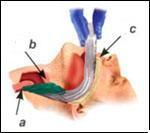 7. Дистальний кінець повітроводу з манжетою вводять в рот хворого у напрямку до твердого піднебіння; 8. Безперервно, не застосовуючи надмірної сили, проштовхуємо повітровід вниз і назад вздовж твердого піднебіння, поки не виникне відчуття значного опору;. 9. (a) кінчик повітроводу впирається у вхідний отвір стравоходу (мал.2 а), (b) манжета знаходиться в контакті зі структурами гортані (мал. 2 б), (c) різці пацієнта знаходитися на рівні захисного блоку (мал. 2 в);