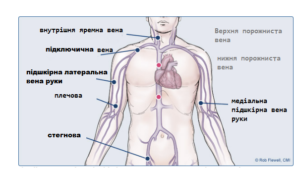 На малюнку зображено деякі ділянки на верхніх кінцівках для внутрішньовенного введення. Необхідне обладнання: · Розчин спирту або розчин антисептику · Рукавички · Джгут · Катетер розміру 18, 16 або 14 · Стерильний марлевий компрес 2 х 2, або стерильний прозорі напівпроникні пов’язки · Стерильний пластир, стерильна хірургічна стрічка або кріпильний пристрій · 0, 9% стерильний розчин хлориду натрію, ампула 20 мл, без консерванту · Стерильний шприц (об’ємом 3-5 мл) · Контейнер для голок · Розчин для внутрішньовенного введення з приєднаною системою або шприц з фізрозчином для промивання катетера · Штатив для внутрішнього введення, або шнурок, до якого можна прикріпити флакон з розчином Положення кінцівок пацієнта: Ø Коли кінцівки нахилені донизу, капіляри сильніше наповнюються, а це може сприяти вірогідності, що ви успішно зробите внутрішньовенне введення. Ø Якщо шкіра холодна, розітріть або поплескайте по ній, щоб розігріти, або накладіть грілку