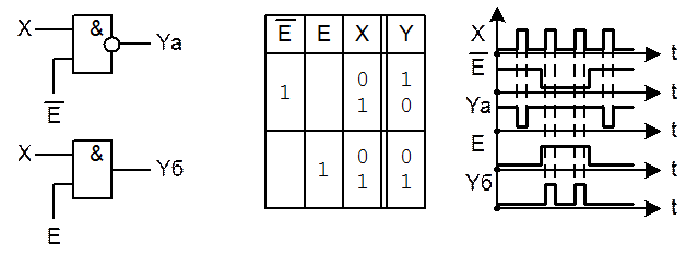 Основне призначення формувачів імпульсних сигналів – перетворення вхідних сигналів довільної форми у нормалізовані (переважно прямокутні) імпульси заданої форми – амплітуди і тривалості для керування такими мікросхемами. Схеми збігу на ЛЕ належать до найпростіших формувачів імпульсних сигналів. На рис.2.2 показано схеми збігу для двох випадків дозволяючих рівнів