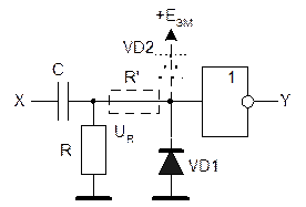 У даній схемі вихідний імпульс формується за рахунок “завалювання” зрізу або фронту вхідного імпульсу після дії RС-кола. Схема збігу закінчує формувати зріз вихідного імпульсу в момент часу, коли напруга Щоб не порушити номінальних параметрів ЛЕ у випадку ТЛЛ, допускаються такі значення елементів RC-ланки: