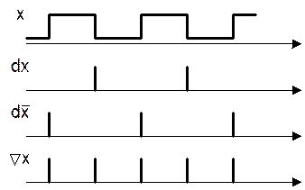 Відмінною особливістю асинхронних тригерів є те, що запис інформації у них здійснюється безпосередньо з надходженням інформаційного сигналу (або сигналів), що подано на інформаційний вхід (або входи) тригера. У синхронного тригера, крім інформаційного, є так званий тактовий (синхронізуючий) вхід для тактових імпульсів, які дають дозвіл на запис інформації. Асинхронні тригери застосовуються у колах керування, а також як складова частина більш складних тригерів. Синхронні тригери реагують на інформаційні сигнали тільки при наявності тактових (синхронізуючих) сигналів. Вони мають найбільше застосування у ЦТ, бо особливість їх роботи забезпечує відсутність таких негативних явиш у колах цифрових сигналів, як “гонки”. Розрізняють два типи цифрових сигналів, часові параметри яких здатні змінити стан тригера: потенціальні та імпульсні (рис.5.3). Потенціальні сигнали
