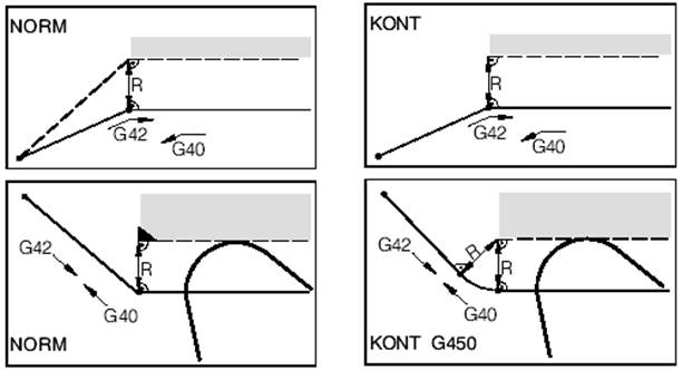 KONT: инструмента проходит вокруг точки контура как запрограммировано в G450/451. G450: по дуге G451: по прямой