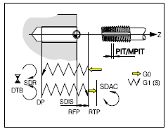 Последовательность обработки: • Перед выполнением цикла, инструмент должен быть размещен над позицией отверстия (X=0). • Быстрое перемещение на расстояние безопасности. • Нарезание внутренней резьбы до окончательной глубины DP с запрограммированной скоростью шпинделя. • Время выстоя на окончательной глубине. • Изменение направления шпинделя в соответствии с SDR. • Отвод на расстояние безопасности • Быстрый отвод в плоскость отвода RTP. • Восстановление направления вращения шпинделя SDAC.