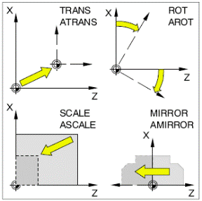 • Сдвиг системы координат: TRANS, ATRANS • Вращение системы координат: ROT, AROT • Программируемый масштабный коэффициент: SCALE, ASCALE • Зеркальная система координат: MIRROR, AMIRROR