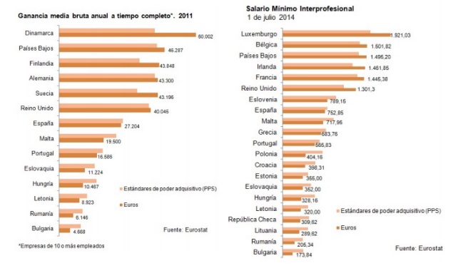 Paí ses sin salario mí nimo La salud del mercado laboral en té rminos de tasa de paro tambié n es superior en los paí ses que no tienen un salario mí nimo ('SM'). La media aritmé tica de la tasa de paro de los Estados que no tienen SM se establece en el 7, 1%. La lista de estos paí ses sin legislació n en cuanto al SM está formada por: Dinamarca, Alemania (tendrá SM a partir de 2015), Repú blica Checa, Italia, Chipre, Austria, Noruega, Islandia, Suecia, Suiza y Finlandia. Aunque es cierto que dentro de estos paí ses existen grandes disparidades. Por ejemplo, la tasa de paro en Chipre que no tiene es del 15, 1%, mientras que por ejemplo Noruega tan só lo tiene una tasa de paro del 3, 7%. Alemania, con una població n que supera los 80 millones de habitantes ha sido siempre un ejemplo para los defensores de la libertad salarial, su tasa de paro es del 5%. Por otro lado, la media anual de los salarios brutos en estos paí ses son mucho má s altos que los de los Estados con SM establecido. El salario medio de Dinamarca supera los 60.000 euros, en Suiza es aú n superior y rebasa los 70.000 euros anuales. Finlandia con 43.848 euros y Alemania con 43.300 euros son otros dos buenos ejemplos de los elevados salarios en este tipo de paí ses. Paí ses con salario mí nimo La lista de paí ses con salario mí nimo es algo má s larga: Bé lgica, Bulgaria, Estonia, Irlanda, Grecia, Españ a, Francia, Letonia, Lituania, Luxemburgo, Hungrí a, Holanda, Polonia, Portugal, Rumaní a, Eslovenia, Eslovaquia y Reino Unido. El paí s con el salario mí nimo má s elevado es Luxemburgo, con un SM bruto anual de 1.900 euros, en el lado opuesto está Bulgaria con 173, 84 euros.