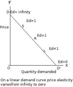 In order to measure elasticity in case of a non linear curve we draw a tangent at the given point R on the demand curve DD’ and then measure price elasticity by finding out the value of RT’/RT. On a Linear Demand curve price elasticity varies from Zero to infinity. This can be represented diagrammatically as follows.In this diagram elasticity is being calculated at five points D, S, R, Land D'.