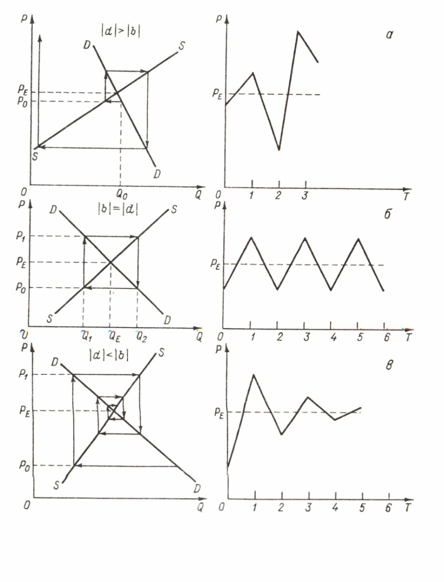 QiD = QiD(Pt), QiS = QiS (P t-1), где t— определенный период времени (t = 0, 1, 2,..., T). Это значит, что производители определяют в период t-1 объем предложения следующего периода t, предполагая, что цены периода t-1 сохранятся и в период t. Если абсолютный наклон линии спроса превышает наклон линии предложения, отклонение от равновесия ведет к увеличению колебаний цен и объемов, все более удаляющих рынок от равновесного состояния. Если абсолютные наклоны линий спроса и предложения одинаковы, всякое первоначальное отклонение ведет к колебаниям цен и объемов одинаковой амплитуды вокруг равновесного уровня. Если абсолютный наклон линии предложения выше, чем наклон линии спроса, колебания постепенно затухают, нарушенное равновесие восстанавливается. Рассмотрим подробнее ситуацию, представленную на рис. 1.6, б, когда |b| == |d|. Предположим, начальная цена Р 0. В периоде t = 1 производители, ориентируясь на цену Р 0, предложат для продажи продукцию в объеме Q 1, что ниже равновесного уровня QE. Возникший дефицит приведет к повышению цены до P 1. Предполагая, что этот уровень сохранится и в период t = 2, производители увеличат объем предложения до Q 2, что выше равновесного уровня. Избыток предложения приведет к падению цены до P 0 и т. д. Заметим, что все три ситуации, представленные на рис. 1.6, предполагают неизменность функций спроса и предложения во времени. Таким образом, хотя линии спроса и предложения имеют нормальный наклон, запаздывание в реакции предложения на изменение цен может привести к нестабильности равновесия. Отсюда следует, что анализ стабильности не может ограничиваться лишь методом сравнительной статики. Необходимость государственного регулирования возникает не только в связи с несовершенством отдельных рынков (неединственность равновесия, его нестабильность, неполный учет затрат и результатов), но и в связи с необходимостью решения макроэкономических задач (борьба с инфляцией, обеспечение полной занятости, совмещение принципов экономической эффективности и социальной справедливости и ряд других). Такое регулирование может иметь целью стабилизацию равновесия или его сдвиг, приближение к равновесию или, наоборот, отклонение от него. Оно может осуществляться путем прямого контроля за уровнем цен и объемов рынка (установление обязательных государственных цен или рыночных квот), путем использования финансовых инструментов (налогов и дотаций), некоторыми другими методами.