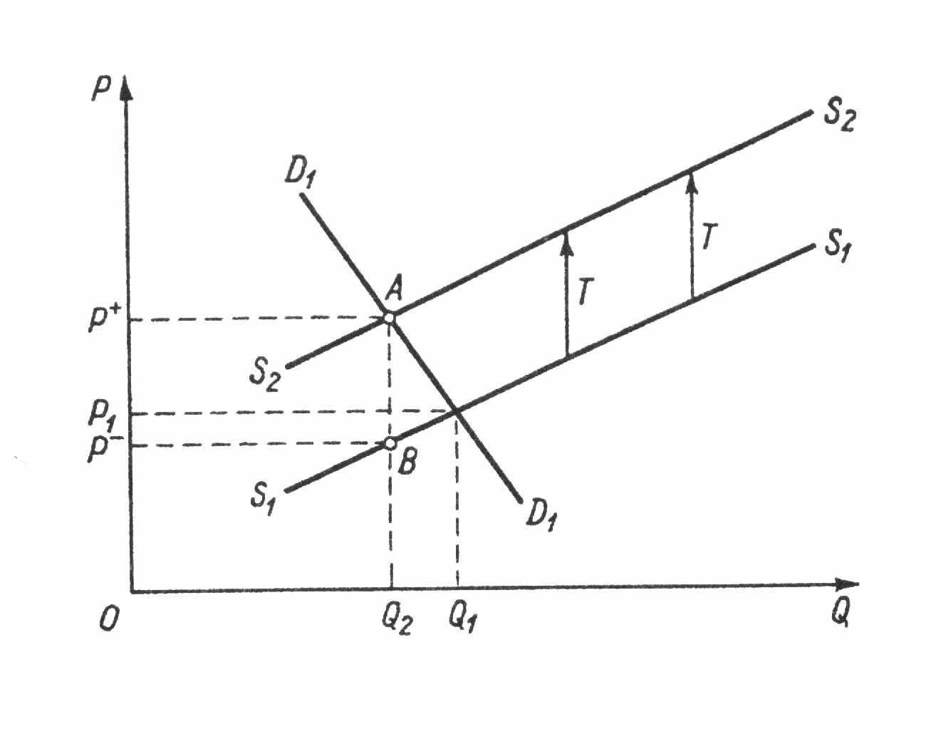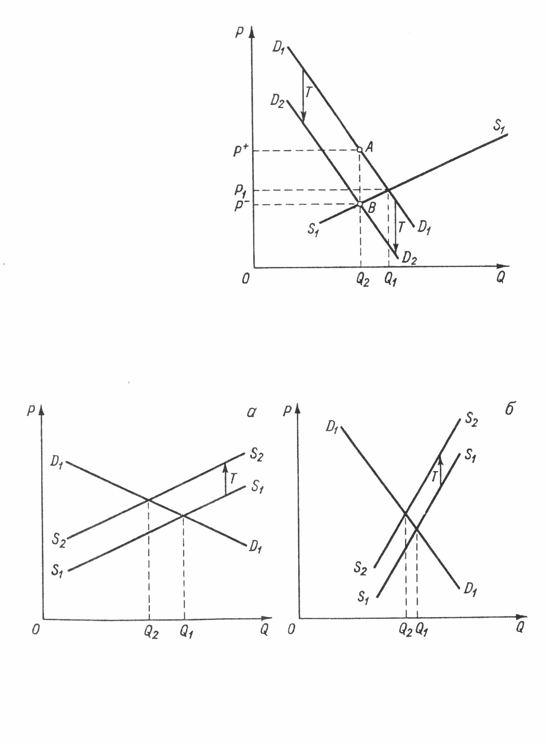 Рассмотрим рис. 1.7. Допустим, что правительство ввело налог на данный товар в сумме Т руб. на каждую единицу этого товара. Предположим сначала, что налог вносится в госбюджет продавцами. Сначала, до введения налога, линия спроса занимала положение D1D1, а линия предложения— S1S1, Равновесная цена составляла P 1, равновесный объем продаж — Q1. Введение налога вызовет параллельный сдвиг линии предложения вверх на величину Т. Почему? Ранее производители согласны были предложить на рынке количество товара, скажем, Q 1, если его цена составит P 1; теперь же они согласятся предложить на рынке то же количество товара, если только цена-брутто (с включением налога) будет на Т руб. выше, чем