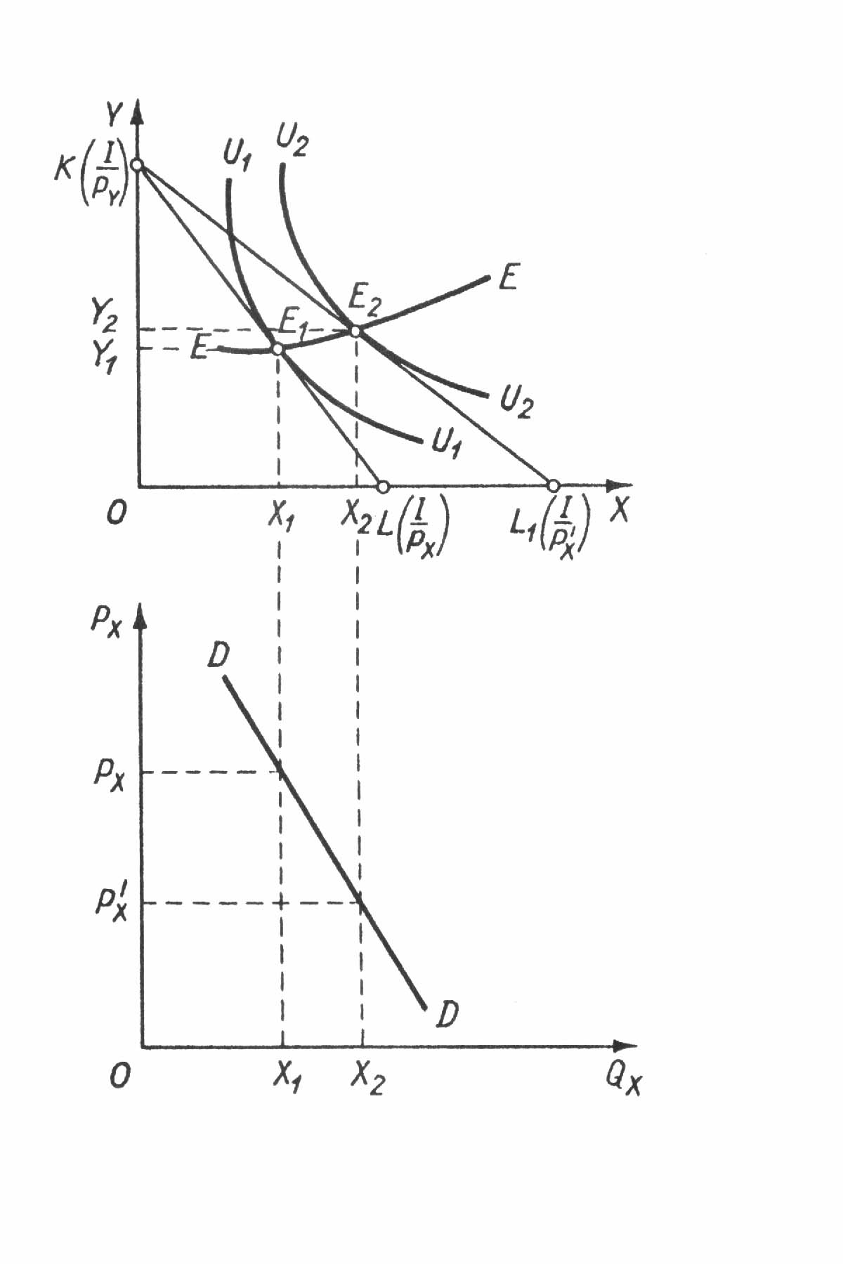 На рис. 2.1 (верхняя часть) показано изменение оптимума потребителя при изменении цены товара X, неизменной структуре предпочтений и прежнем доходе. При снижении Рх. до Р’х бюджетная линия KL поворачивается вокруг точки К против часовой стрелки и занимает положение KL1. Покупатель может теперь приобрести больше товара X, если он израсходует на него весь свой доход. В то же время ему становятся доступными все более удаленные от начала координат кривые безразличия.Оптимум потребителя смещается из точки Е1 в точку Е2. Соединяя все подобные точки, получим линию ЕЕ, называемую кривой Цена-потребление. Она представляет множество всех оптимальных комбинаций товаров Х и Y при изменении цены товара