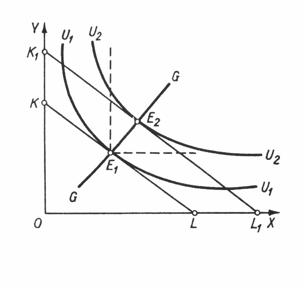 Рассмотрим теперь изменение оптимума потребителя при изменении его дохода (цены и предпочтения остаются неизменными). С ростом дохода бюджетная линия KL смещается в положение K1L1 и потребитель переходит на более высокую кривую безразличия U2U2 (рис. 2.2). Очевидно, что набор Е2 содержит большее количество товаров Х и Y, чем набор Е1. Соединяя все подобные точки, получим кривую GG, называемую кривой доход-потребление. Она представляет множество всех оптимальных наборов или комбинаций товаров при изменении дохода потребителя и неизменном соотношении цен. Как видно из рис. 2.2, кривая доход-потребление имеет положительный наклон, с ростом