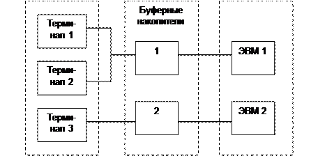 Вычислительная система содержит: 3 терминала, 2 буферных накопителя, 2 ЭВМ (рис. 7). Пользователи приходят через интервалы времени 10 ± 2 мин. Если все три имеющихся терминала заняты, пользователю отказывают в обслуживании. Терминалы могут обеспечить обслуживание средней программы пользователя за 20 ± 5, 40 ± 10 и 40 ± 20 мин соответственно номерам терминалов. Полученные программы сдаются в буферные накопители, откуда выбираются на обработку на первую ЭВМ – программы с 1-го и 2-го терминалов, на 2-ю ЭВМ – программы с 3-го терминала. Время обработки программ на 1-й и 2-й ЭВМ равно 15 и 30 соответственно.