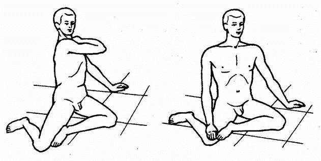 3. Положение Сядьте на пол, примите прежнее положение. Однако, в отличие от прежнего, обе руки упираются в пол, причем правая рука располагается перед левой.