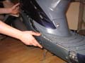 Теперь принимаемся за «лыжи» (11-12), после этих двух болтов выкручиваем саморез из пластмассового фиксатора (13). Затем сдвигаем «лыжу» в направлении хвоста (14), без приложения силы и нервов – пластик должен легко сойти с направляющих. Теперь не помешает снять седло – здесь все просто – открутим две гайки «на 10» и снимем деталь со шпилек (15-16).