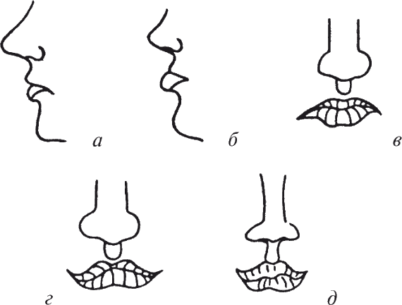 Часто верхняя и нижняя губа плохо согласуются и одна перекрывает другую. Выступающая верхняя губа (рис. 56а) – что просто означает западание нижней – является признаком тщеславного и нерешительного характера. У таких людей также ненасытное либидо. Они часто заводят внебрачные связи. Обратное перекрытие губ указывает на эгоистичного индивидуума, у которого возможен неудачный брак (рис. 56б). Если верхняя губа покрывает большую часть нижней, то такой рот называется «орлиным». Это признак решительного, упрямого человека и, возможно, вспыльчивого поведения. Такие губы чаще бывают у мужчин, чем у женщин. Иногда внешний край нижней губы слегка загибается кверху, особенно посередине. У молодых людей это указывает на вкус к богемному образу жизни. Если линия между губами изгибается книзу (рис. 56в), то это указывает на эгоцентричную, упрямую натуру. Таких людей можно расположить к себе лишь при помощи лести и похвал. Если эта линия, однако, изгибается вверх в середине (рис. 56 г), то это характеризует проворного и изобретательного человека. У женщин линия рта, которая, кажется, таит загадочную улыбку в обоих уголках рта, является указанием на глубоко чувственную натуру. Китайские физиономисты называют такую форму губ «перевернутый полумесяц» (рис. 56д). Она очень распространена среди женщин. Такие женщины хорошие партнеры в семейной жизни. У мужчин губы такой формы встречаются редко, а если иногда встречаются, то это указывает на мягкий, женственный темперамент и на художественные наклонности. Свободно, нетвердо оформленный рот, с уголками, загибающимися книзу (рис. 57а), предостерегает, что индивидуум имеет бурный характер. Брак такого человека обычно кончается разводом. Иногда такая линия рта называется «опрокинутая лодка». У женщин такой рот свидетельствует о сексуальной неразборчивости. Широкий рот, в котором уголки спускаются книзу, а края губ очерчены неровно, обычно характеризует беспокойную, тревожную личность (рис. 57б). Если губы тонкие и плохо закрываются (рис. 57в), то у человека, по-видимому, отсутствует тяга к успешной профессиональной карьере. Если закрытые губы плохо соответствуют друг другу, то это повсюду считается признаком преступных наклонностей.