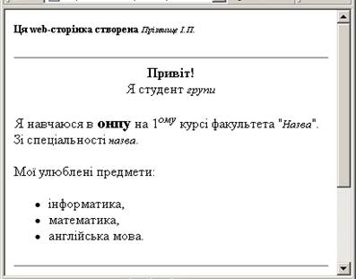 8. Створіть ще один html-файл з розповіддю про себе. Поекспериментуйте з тегами форматування тексту. Використайте якнайбільше тегів форматування і надайте своїй сторінці якнайліпшого вигляду. 9. Збережіть файл із назвою file2.htm. 10. Перегляньте цей файл за допомогою броузера і поекспериментуйте з розмірами вікна, в якому демонструється документ.