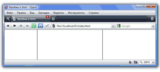 < html> < head> < title> Фреймы в html< /title> < /head> < frameset cols=" 150, 300, *" > < frame> < frame> < frame> < /frameset> < /html>