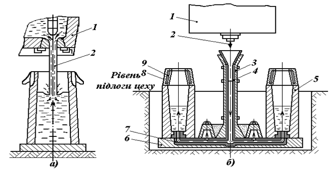 1-ківш; 2-рідка сталь; 3-центральний ливник; 4-вогнетривкі трубки; 5-виливниця;