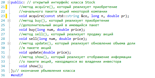 public: // открытый интерфейс класса Stock //метод acquire(), который реализует приобретение //начального пакета акций некоторой компании void acquire(const std:: string & co, long n, double pr); //метод buy(), который реализует приобретение //дополнительный акций в имеющийся пакет void buy(long num, double price); //метод sell(), который реализует продажу акций void sell(long num, double price); //метод update(), который реализует обновление объема доли //в пакете акций void update(double price); //метод show(), который реализует отображение информации //о пакете акций, находящихся во владении инвестора void show(); }; // окончание рбъявления класса #endif