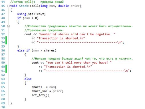 //метод sell() - продажа акций void Stock:: sell(long num, double price) { using std:: cout; if (num < 0) { //Количество продаваемых пакетов не может быть отрицательным. //Транзакция прервана. cout < < " Number of shares sold can't be negative. " < < " Transaction is aborted.\n" < < " --------------------------------------------\n"; } else if (num > shares) { //Нельзя продать больше акций чем те, что есть в наличии. cout < < " You can't sell more than you have! " < < " Transaction is aborted.\n" < < " --------------------------------------------\n"; } else { shares -= num; share_val = price; set_tot(); } }