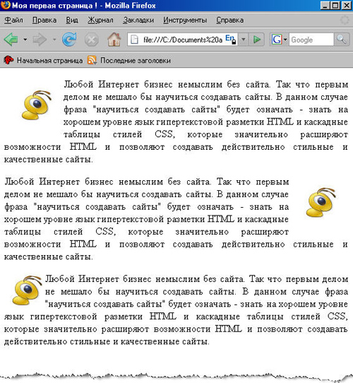 Вот еще очень необходимые атрибуты: ALIGN - определяет способ выравнивания картинки по горизонтали. Очень полезное свойство при обтекании картинки текстом. Обычно используют LEFT (выравнивание по левому краю, текст будет обтекать справа) и RIGHT (выравнивание по правому краю, текст обтекает слева).Если на странице есть текст, то это обязательное свойство. HSPACE и VSPACE - отступы в пикселях по горизонтали и по вертикали от картинки до других обьектов документа. Легко запомнить название если взять и просто перевести с английского. HSPACE - Horizontal Space - горизонтальный отступ и VSPACE - Vertical Space - вертикальный отступ. HEIGHT и WIDTH - высота и ширина изображения в пикселах. Золотое правило web-мастера – всегда явно задавать размеры картинки в атрибутах HEIGHT и WIDTH, резервируя тем самым место в окне браузера еще до загрузки изображения. В противном случае документ при загрузке каждой картинки будет заново перерисовываться. А на медленных машинах (или при подключении к сети через модем) это смотрится просто отвратительно. Но в принципе, можно и не задавать размеры, просто будет дольше загружаться. И еще, не советую Вам искажать реальные размеры картинки. Ладно, лучше все смотреть на примерах: <! -- первый пример с отступами и выравниванием по левому краю--> < p align=" justify" > < img src=" pchela.jpg" width=" 65" height=" 59" hspace=" 15" vspace=" 15" align=" left" > <! --третий пример без отступов, с выравниванием по левому краю--> Вот результат браузере: