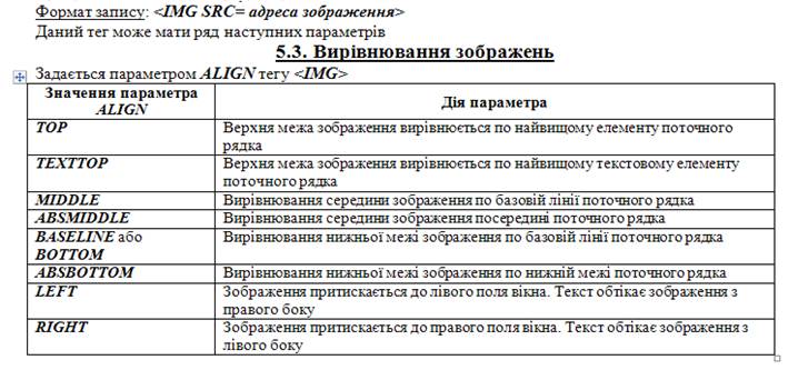 4. ТАБЛИЦІ 4.1. Елементи таблиці Таблиці будуються за принципом вкладення і вводяться за допомогою ряду елементів. Кожна таблиця починається тегом < TABLE> і закінчується тегом < /TABLE>. Створювана таблиця ніби розгортається по рядках, а рядки заповнюються комірками. При цьому всередину тегів < TABLE>...< /TABLE> можуть вставлятися такі елементи: · < TR> – елемент створення рядка, · < TD> – елемент, що визначає вміст комірки даних, · < TH> – елемент, що визначає комірку заголовка. Приклад, що визначає шаблон створення таблиці 3*2: < TABLE> < TR> < TD>...< /TD> < TD>...< /TD> < /TR> < TR> < TD>...< /TD> < TD>...< /TD> < /TR> < TR> < TD>...< /TD> < TD>...< /TD> < /TR> < /TABLE> Таблиця може мати і заголовок, обмежений парою тегів < CAPTION> і < /CAPTION>. · Заголовок таблиці < CAPTION> Заголовок таблиці < CAPTION> має єдиний допустимий параметр align, який визначає розміщення заголовку: ALIGN=TOP – заголовок над таблицею (за замовчуванням), ALIGN=BOTTOM – заголовок під таблицею. · Параметри тега < TABLE> BORDER – вивід зовнішньої рамки таблиці в пікселях (за замовчуванням BORDER=1). CELLSPACING. Форма запису: CELLSPACING = число, яке визначає відстань в пікселях між рамками сусідніх комірок як по горизонталі, так і по вертикалі (за замовчуванням CELLSPACING =2 ). CELLPADDING. Форма запису: CELLPADDING = число, яке визначає розмір вільного місця (відступу) в пікселях між рамкою комірки і даними всередині комірки (за замовчуванням CELLPADDING=1). ALIGN – задає вирівнювання таблиці у документі. Допустимі значання: · ALIGN = LEFT – розміщення таблиці уздовж лівого краю документа, · ALIGN = RIGHT – уздовж правого краю документа · ALIGN = CENTER – по центру документа. HEIGHT – задає висоту таблиці в пікселях. WIDTH – задає ширину таблиці в пікселях чи процентах (від повної ширини вікна). 4.2. Атрибути елементів рядків і стовпців · WIDTH і HEIGHT – установлюють розміри комірок рядка: ширину і висоту (можуть використовуватися в тегах < TD>, < TH>, < TR>). · ALIGN – вирівнюють вміст в комірках. Атрибут може набувати значень LEFT, RIGHT, CENTER, JUSTIFY (вирівнювання по ширині). (можуть використовуватися в тегах < TD>, < TH>, < TR>). · VALIGN – вирівнюють вміст по вертикалі. Можливі значення: TOP (вирівнювання по верхньому краї комірок), BOTTOM (вирівнювання по нижньому краї), MIDDLE (центрування по вертикалі). Приклад: < TR VALIGN = MIDDLE> Крім того, при форматуванні вмісту комірок можна застосовувати теги форматування заголовків (< H1> …< H6>), символів (< B>, < I>, < FONT SIZE > тощо), вставки графічних зображень (< IMG >), вставки гіперпосилань, теги розміщення тексту (< P>, < BR>, < HR >) тощо. 4.3. Колір у таблицях Атрибути, що визначають колір таблиць: · BGCOLOR – колір фону в таблиці (може використовуватися в тегах < TABLE>, < TD>, < TH>, < TR>). · BORDERCOLOR – колір рамок таблиці (може використовуватися в тегах < TABLE>, < TD>, < TH>, < TR>).