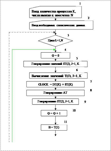 Рис. 6.2. Блок-схема расчета модели фирмы. Блок 1 на рис. 6.2 описывает ввод в ЭВМ параметров К (общее число процессов в модели) и N (число повторений имитационного просчета). В память машины вводятся значения Р, С, ТМ, ЕАТ и ЕSТj (j =1, …, k). Эти величины служат параметрами данного плана. Заметим, что на блок-схеме величина SТj обозначена SТ(J) в соответствии с требованиями машинного языка ФОРТРАН. В блоках 3 и 4 осуществляются начальные процедуры, в которых величине L (указатель номера реплики) присваивается 1, а величине Q (число единиц готовой продукции) присваивается 0. В блоке 5 подпрограммой экспоненциального распределения с отрицательным показателем генерируются величины затрат времени на производство. Затем по формулам (6.7) - (6.9) подсчитываются времена простоя, ожидания и полное время пребывания первого заказа в каждом производственном процессе. В программе используется системное время СLOСК. В блоке 7 эта величина подсчитывается как сумма времени простоя и времени, затраченного на производство, для K-го процесса. К концу планового периода системное время становится не меньше продолжительности периода ТМ. Блок 8 генерирует промежуток времени АТ между поступлениями первого и второго заказов. Таким образом, этот блок дает указание о поступлении второго заказа. После этого в блоке 9 генерируется K новых величин затрат времени на производство. Блок 10 увеличивает общее число выполненных заказов на 1. В блоках 11 и 12 величинам B и D присваиваются значения T(1) и АТ соответственно. Блоки от 13 до 21 повторяются K раз — по одному для каждого производственного процесса. В блоке 14 по формулам (7.11) вычисляются разности WТ(J), играющие роль DIF(J). Если WT(J)> 0, то время простоя равно нулю, а время ожидания равно NT(J). Если WT(J)=0, то и время ожидания, и время простоя равны нулю. Если же WT(J)< 0, то время ожидания равно нулю, а время простоя равно WT(J). В блоке 19 по формулам (6.10) для j-го процесса подсчитывается значение Т (J). Величины B и D пересчитываются в блоках 20 и 21 по формулам (6.11). Системное время СLOСК пересчитывается в блоке 22. Если время СLOСК меньше ТМ, происходит обращение к блоку 8 и генерируется еще один промежуток времени между поступлениями заказов и K величин затрат времени на производство. Если же системное время СLOСК не меньше ТМ, то закончена одна реплика расчета первого плана. Полная прибыль в этой реплике подсчитывается по формуле (6.18) и выводится на печать. Если число реплик L меньше числа необходимых просчетов N для этого плана, то L увеличивается на 1 и с блока 4 начинается новая реплика. 1 READ 2, K, N 2 FORMAT(2I2) 3 DIMENSION EST(K), ST(K), T(K), WT(K), DT(K) 4 READ 5, P, C, TM, EAT, (EST(J), J = 1, K) 5 FORMAT(10F10.2) 6 L = 1 7 Q = 0. 8 DO 10 J = 1, K 9 CALL RAND (R) 10 ST(J) = -EST(J)*LOGF(R) 11 K1 = K - 1 12 DT(1) = 0. 13 DO 14 J=1, K1 14 DT(J+1)=DT(J) + ST(J) 15 DO 17 J=1, K 16 WT(J) = 0. 17 T(J) = ST(J) 18 CLOCK = DT(K) + ST(K) 19 CALL RAND (R) 20 AT = - EAT*LOGF(R) 21 DO 23 J = 1, K 22 CALL RAND (R) 23 ST(J)= - EST(J)*LOGF(R) 24 Q = Q+1.0 25 B = T(1) 26 D = AT 27 DO 37 J = 1, K 28 WT(J)=B - D 29 IF(WT(J)) 30, 30, 33 30 DT(J)= - WT(J) 31 WT(J) = 0. 32 GO TO 34 33 DT(J) = 0. 34 T(J) = WT(J) + ST(J) 35 B = B + T(J + 1) 36 D = D + WT(J) + ST(J) 37 CONTINUE 38 CLOCK = CLOCK+ DT(K) + ST(K) 39 JF(CLOCK —TM) 19, 40, 40 40 PROFIT =P*Q - C 41 PRINT 42, PROFIT 42 FORMAT(F10.2) 43 IF(L - N) 44, 4, 4 44 L = L + 1 45 GO TO 7 46 END