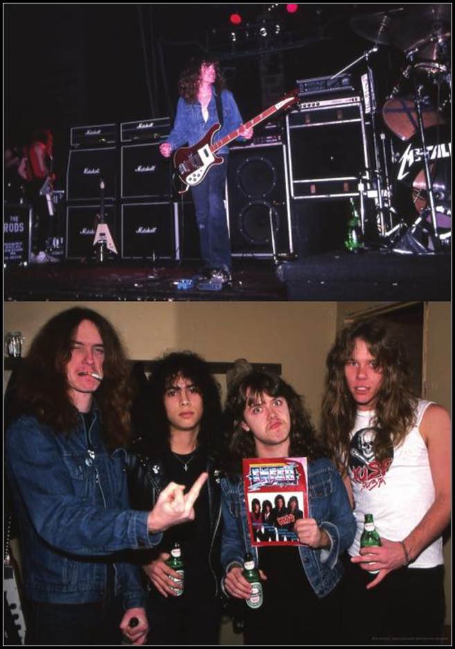 «Металлика» (на этой странице) с основателем лейбла «Megaforce» Джоном “Джонни Зи” Зазулой, в апреле 1983. Львиная доля раннего успеха команды целиком и полностью является заслугой Зазулы. Клифф (вверху справа), управляющий педалью «вау-вау» и (снизу справа) в апреле 1983, немного старше и мудрее остальной части группы, Клифф, совершенно не беспокоящийся о том, что о нём напишет пресса.