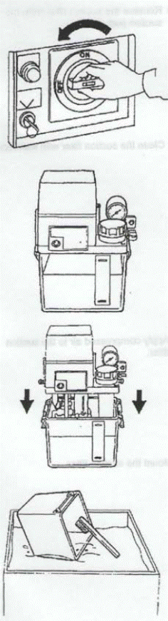 2) Переведите выключатель питания (POWER) в положение «выключено» (OFF). 3) Убедитесь, что бак заполнен смазкой. 4) Откройте крышку слева внизу передней части станка.