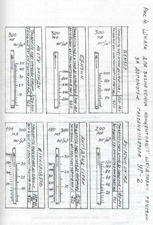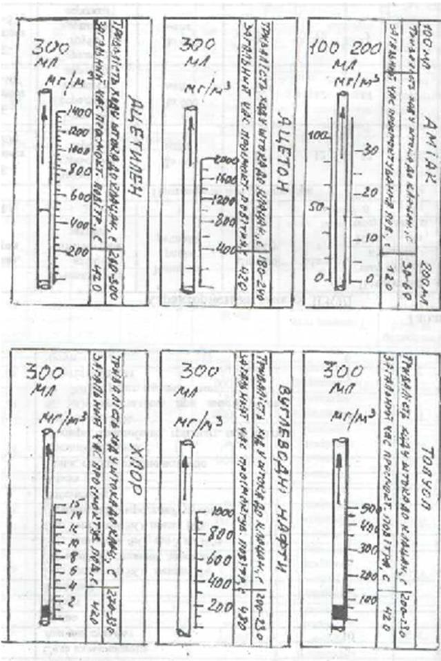 | Ацетилену, етилену, бензину, бензолу, спиртів, ацетону, сполук сірки, хлору, азоту оксидів
