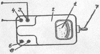 Рис. 11.1. Мегомметр типу М-1 10 ІМ: 1 -шкала, 2-передня сторона приладу, 3 і 4 (лінія і земля) -затискачі, 5-ручка-перемикач (кОм, МОм), 6-затискач-екран, 7-ручний привід. ІІ. Виміряти особистий опір тіла. Перед вимірюванням опору тіла перевірити, чи ручка-перемикач 5 встановлена на позначку кОм. До затискачів 3 і 4 під’єднати два металевих провідники (без ізоляції). Ручний привід 6 поставити в робоче положення. Людина, опір тіла якої вимірюється, повинна однією рукою взятись за металевий провідник, під'єднаний до затискача З, а другою - за провідник, під'єднаний до затискача 4, Інша особа, тримаючи лівою рукою верхню частину приладу, правою рукою повинна обертати ручний привід 7 при швидкості обертання не менше 120 об/с до тих пір, поки стрілка по шкалі 1 не зупиниться на постійному значенні опору (кОм). Далі одночасно припинити обертання ручного приводу 7 і відпустити руки від провідників, що під’єднані до затискачів 3 і 4. Одержане значення опору тіла записати в табл..., розрахувати значення сили струму, що протікала через тіло і зробити відповідний висновок.