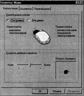 Рис. 2. Диалоговое окно «Свойства: Клавиатура» ключения языка. Кнопка < Сделать основным> позволит выбрать основной язык при загрузке операционной системы. Поставьте флажок Вывести индикатор, что позволит переключать язык на Панели задач при помощи мыши. Внимание! С помощью вкладки Общие можно изменить тип используемой клавиатуры. Например, если вы перейдете на использование клавиатуры AT& T, Olivetti или более ранний тип клавиатуры IBM XT, то не забудьте щелкнуть по вкладке Общие и внести в установки соответствующие изменения. Если вы хотите добавить раскладки клавиатуры для языков, отличных от стандартного английского, щелкните по кнопке < Свойства>. Для настройки параметров мыши: · откройте папку Панель управления и дважды щелкните по значку Мышь; · в диалоговом окне «Свойства: Мышь», в зависимости от того, какой рукой вы предпочитаете управлять мышью, выберите переключатель Обычная или Для левши на вкладке Кнопки мыши (рис. 3). Настройте скорость выполнения двойного щелчка путем перемещения ползунка между значениями Низкая и Высокая. Двойным щелчком в Области проверки проверьте новую скорость срабатывания двойного щелчка; · откройте вкладку Указатели (рис. 4). Для изменения внешнего вида указателя выполните следующие действия: