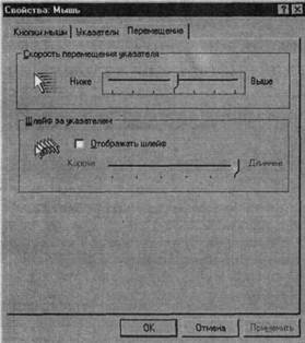Рис. 3. Вкладка Кнопки мыши Рис. 4. Вкладка Указатели • после выбора нового изображения какого-либо указателя сохраните его для последующего использования, щелкнув по кнопке < Сохранить как> и присвоив ему новое имя. Внимание! Для восстановления первоначальной схемы указателей Windows выберите схему, используемую по умолчанию, щелкнув по кнопке восстановить исходную>. · Откройте вкладку Перемещение (рис. 5). В окне «Скорость перемещения указателя» сдвиньте ползунок влево или вправо для изменения скорости, с которой указатель перемещается на экране, когда вы двигаете мышью по коврику. Для демонстрации работы мыши после выполненных изменений щелкните по кнопке < Применить>; · для того чтобы следить за перемещением указателя, установите флажок Отображать шлейф. Переместите ползунок Шлейф за указателем в сторону Короткий. Это приведет к появлению " хвоста" из нескольких указателей, которые будут следовать за курсором по мере его перемещения по экрану. Если у вас портативный компьютер с жидкокристаллическим дисплеем, установите эту опцию в позицию Длинный; · для выбора драйвера мыши откройте вкладку Общие и выберите тип мыши, которая была инсталлирована. 5. Для установки звуковых сигналов для событий: · откройте папку Панель управления и дважды щелкните по значку Звук; · в окне «События» (рис. 6) выберите требуемое системное событие: выход из Windows, критическая ошибка, всплывающее меню, открытие программы, закрытие программы; ■
