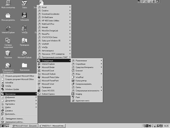 После загрузки Windows большую часть экрана занимает так называемый Рабочий стол, причем он выглядит так же, как поверхность обычного стола. На нем можно " разложить" нужные документы, программы (приложения) в виде ярлыков (значков). Настройка Рабочего стола включает в себя размещение на столе ярлыков для наиболее часто используемых приложений, документов и принтеров, а также изменение параметров фона стола, рисунков заставок и другие действия. Запуск приложения, обозначенного ярлыком, производится установкой на него указателя мыши и двойным щелчком ее левой кнопки. Рассмотрим основные элементы Рабочего стола.