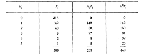 Для дискретних даних таблиці 7.2 необхідні обчислення зведено в таблицю 7.3, а для неперервних даних таблиці 7.1 — в таблицю 7.4. Спочатку було зроблено припущення, що даним таблицям. 7.2 може відповідати розподіл Пуассона. Із [1,..., 3] відомо, що в цьому розподілі середнє дорівнює дисперсії (зазвичай позначається Таблиця 7.4 Обчислення статистичних параметрів для неперервних даних табл. 7.1