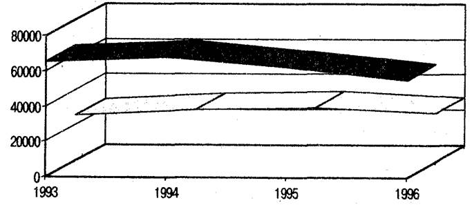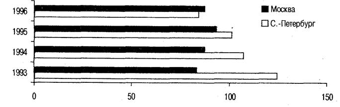 Наиболее распространенный вид диаграмм для наглядного изображения динамики — линейчатые. Их преимущество состоит в том, что динамика изображается в виде непрерывной линии или полосы, характеризующих непрерывность процесса. Линейчатая диаграмма позволяет выражать одновременно ряд показателей, а следовательно, сопоставлять их друг с другом. В качестве примера приведем графическое изображение динамики регистрации преступлений в Москве и С.-Петербурге. ЗАРЕГИСТРИРОВАНО ПРЕСТУПЛЕНИЙ В РОССИИ, тыс.