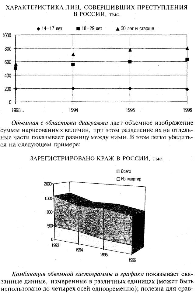 сивность какого-либо показателя в пределах территориальной единицы. На точечной картограмме уровень выбранного явления изображается с помощью точек. Пример фоновой картограммы, иллюстрирующей раскрываемость и уровеньирестунности в РФ, см. на рис. 2, 3. ■ Карты обслуживаемой, например, органами внутренних дел территории с нанесенными на них карандашом, булавками, флажками или каким-либо иным способом явлениями (преступлени-. ями, ДТП, пожарами и т.д.) широко используются в практике этих органов. Особенность картограмм, составляемых в оперативных целях, — то, что на них приходится отмечать динамику правонарушений. Это вызывает необходимость построения картограмм с подвижными, легко пополняемыми'и убираемыми условными знаками. Картодиаграмма— это сочетание.географической карты или ее схемы (с четким административным делением и с удалением географического содержания) с диаграммой. Различные фигуры при этом ставятся не в ряд, как на обычной диаграмме, а разносятся в определенном масштабе но всей карге в соответствии с тем районом, которые они представляют. Картодиаграммы дают возможность графически отразить более сложные статистико-географические построения, чем картограммы. Элементы простейшей картодиаграммы можно обнаружить на политической карте, где города отмечаются различными геометрическими фигурами в зависимости от численности населения. Аналогично можно изобразить карту регионов страны, обозначающую уровень преступности в них. Помимо рассмотренных графиков в статистике применяется ряд других способов графическою изображения статистических данных. Мы не останавливаемся на них, поскольку в аналитической работе правоохранительных органов и судов широкого применения они не находят. При построении графика одинаково важно все — правильный выбор графического изображения, пропорций, соблюдение правил оформления графиков и, конечно, их чтение. Подробнее все эти вопросы освещаются в специальной литературе, рекомендованной к данной главе. С внедрением в практику правоохранительных органов ЭВМ и специальных графических устройств к ним появляется возможность не только быстро осуществлять ввод и вывод построений (диа 320 Глава VI. Представление данных правовой статистики: табличный и графический методы грамм, картограмм и т.д.), но и (что более важно) оперативно вмешиваться непосредственно в процесс их создания, внося необходимые коррективы в изображение, заменяя частично или полностью его элементы и способствуя тем самым более полному и глубокому анализу изучаемого явления'. На компьютерной графике основаны некоторые процедуры классификации (группировки) данных, анализа динамики: выявления тенденций, сравнения динамики разных социально-правовых показателей и т.д. Все виды графических изображений могут характеризовать правовые явления в абсолютных данных и относительных показателях. В заключение обратим внимание на некоторые общие правила чтения графиков. Необходимо начинать с чтения заголовка графика. Осмыслив его, мы поймем, о чем говорит график, какие сведения можно и какие нельзя из него получить. Затем надо разобраться в специфических условностях данного графика (шкалы, масштабы, единицы измерения, условные базы и т.д.). Выяснив строение графика и разобравшись в элементах его графического образа, н