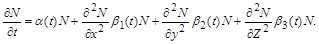 де за певних співвідношень між Урахування запізнення в ланцюгу оберненого зв’язку математичної моделі локатора (відоме рівняння Мінорського) дозволило виявити стійкі коливання у Перейдемо до ще однієї ланки. Усі вказані вище моделі апріорі будувалися на тому, що кількість особин усіх видів у просторі розміщується однорідно. Якщо врахувати залежність кількості особин не тільки від часу, а й від розташування в просторі, то прийдемо до моделей біологічних популяцій з дифузією, що математично зображуються системою параболічних рівнянь у частинних похідних. Для одновидової популяції, де