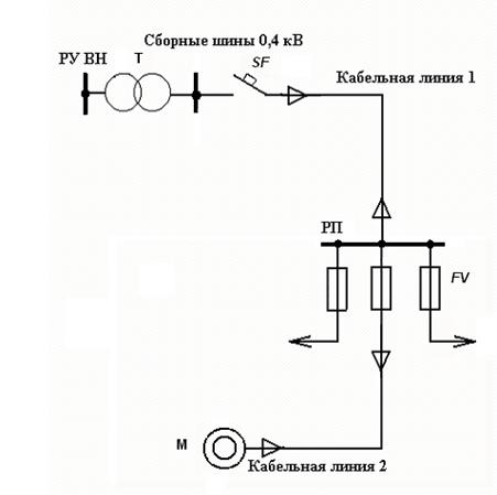 Рис. П.5.1. Схема участка сети цеха промышленного предприятия: РУ ВН – распределительное устройство высшего напряжения; Т – трансформатор; SF – автоматический выключатель; РП – распределительный пункт; FV – предохранитель; М – асинхронный двигатель