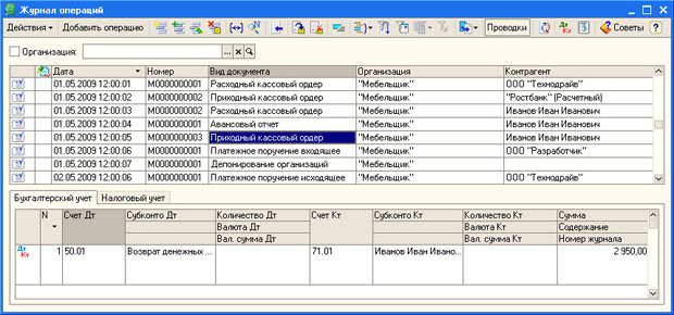 В его верхней части находится панель инструментов, далее следует табличное поле, которое содержит список документов, отражающихся в журнале. Если на панели инструментов нажата кнопка Проводки (эта кнопка так и подписана в панели инструментов, если вы не знаете названия кнопки, обозначенной пиктограммой - подержите над ней указатель мыши - появится подсказка) - в нижней части окна журнала отображаются две дополнительные вкладки, которые содержат информацию по проводкам, которые формирует выделенный документ. Как видите, это две вкладки - Бухгалтерский учет и Налоговый учет - так как 1С: Бухгалтерия предусматривает параллельное ведение бухгалтерского и налогового учета, документы могут служить основанием и для записей в бухгалтерском учете и для записей в налоговом учете.