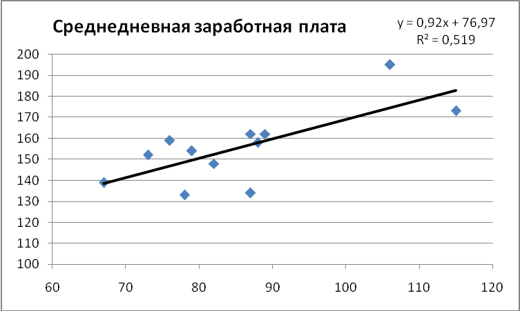 Таким образом, между заработной платой (y) и среднедушевым прожиточным минимумом (x) существует прямая достаточно сильная корреляционная зависимость.