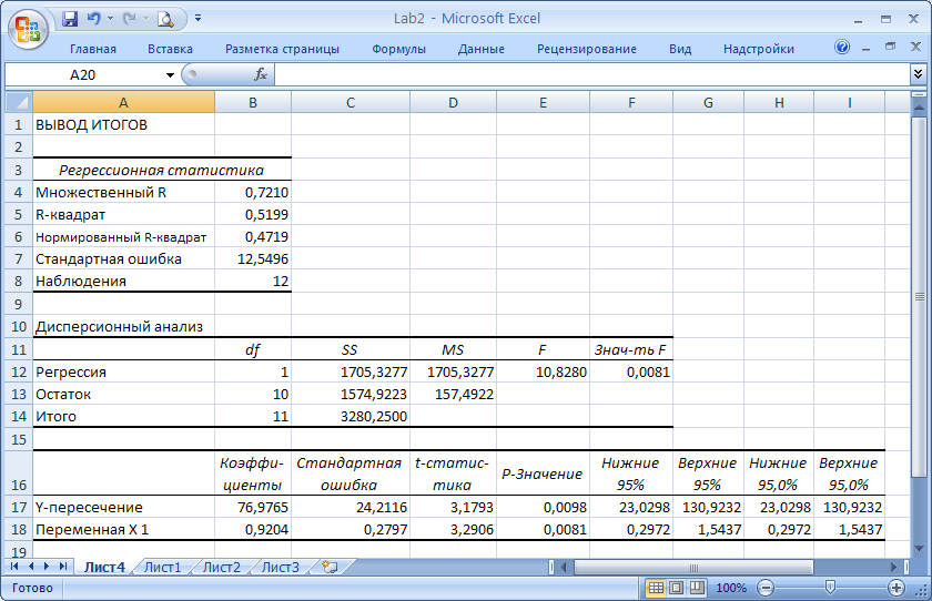 По полученным результатам сделайте выводы об адекватности построения модели экспериментальным данным. Задачи регрессионного анализа можно решать с использованием ЭВМ. Например, в программе Excel достаточно ввести свои данные и использовать пакет Анализ данных. Опишем кратко последовательность действий: а) проверьте доступ к пакету анализа. В главном меню последовательно выберите Сервис/Надстройки. Установите флажок Пакет анализа; б) в главном меню выберите Сервис/Анализ данных/Регрессия. Щелкните по кнопке ОК; в) заполните диалоговое окно ввода данных и параметров вывода: - Входной интервал Y – диапазон, содержащий данные результативного признака; - Входной интервал X – диапазон столбцов, содержащие значения факторов независимых признаков. Результаты регрессионного анализа представлены на рисунке 2.4. Сравните стандартную ошибку регрессии и Т -статистики коэффициентов с полученными значениями, показанными на рисунке 2.8!!!